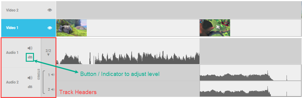 A user can either user the slider to set the desired dB value or enter the value into the freetext field. Afterwards, the header track will display the value on the track indicating that audio level adjustments apply to this track. When playing back the timeline the peak meter will also display the correct dB values for the audio mixdown of the timeline including the level adjustments.