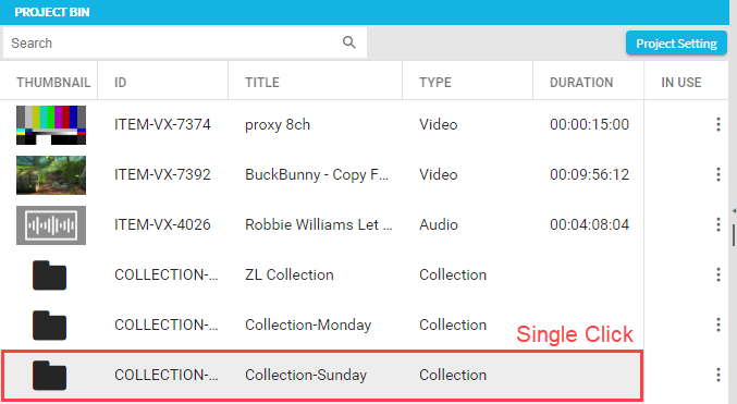 Once the collection is imported to the project bin, the user is able to navigate into the collection using a single click on the collection: