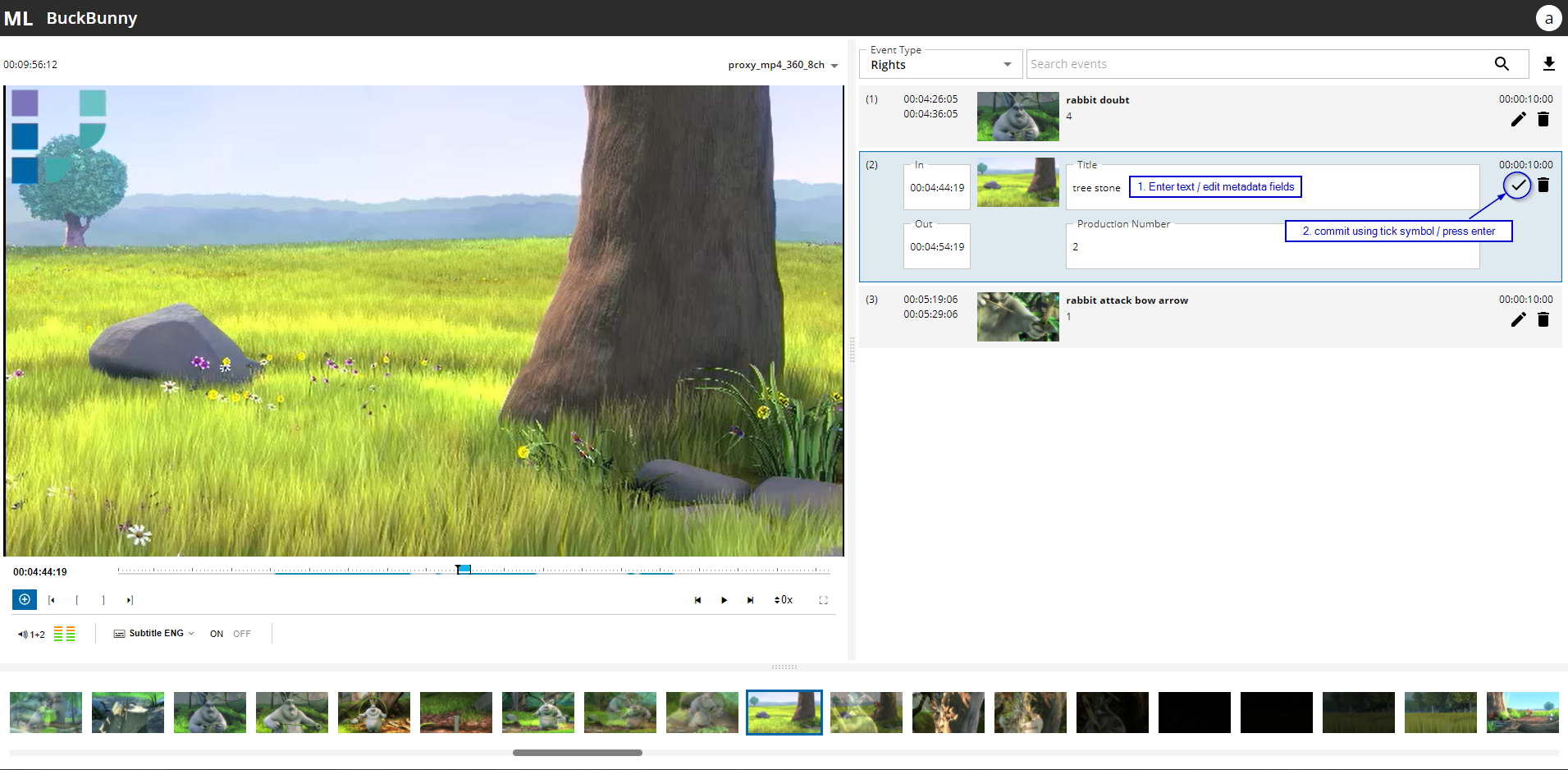 Add event button from the player controls or alternatively use “a” as a shortcut. The event is directly created and the focus will be in the first editable field so that you can start typing immediately. Changes are committed by clicking the tick-symbol or pressing “enter”.