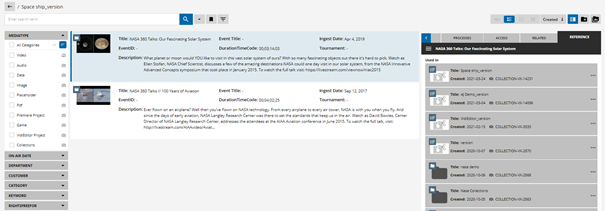 Collections can be accessed directly within the search results. Selecting a collection will show which items or sub collections are inside, allowing for a more refined search. The same principle applies to editing projects, such as from Premiere or VidiEditor.