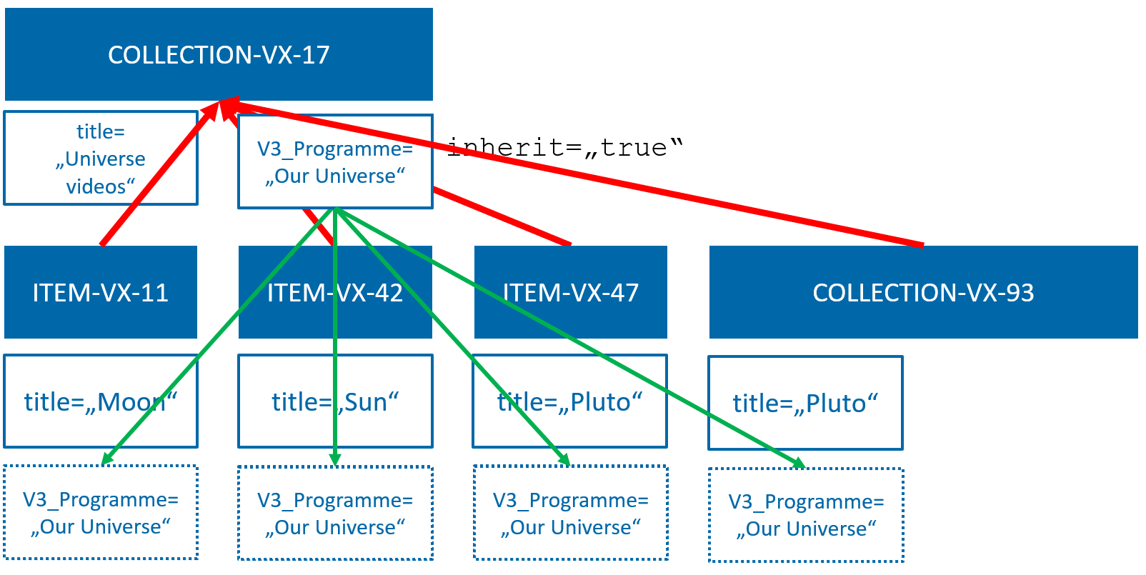 Inheritance can be broken by setting a field value directly on an item or a sub-collection. If you set the the V3_Programme field on ITEM-VX-42 to Another Universe explicitly the value Our Universe originally inherited from COLLECTION-VX-17 will not be available on ITEM-VX-42 any more: